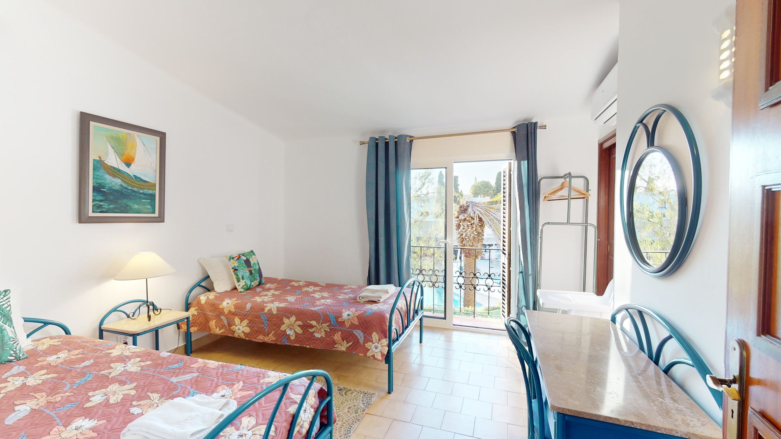 The bedrooms, both with two single beds each, closets with hangers, air conditioning and a balcony. Between the bedrooms there is a bathroom with bathtub, washbasin, bidet and hairdryer.