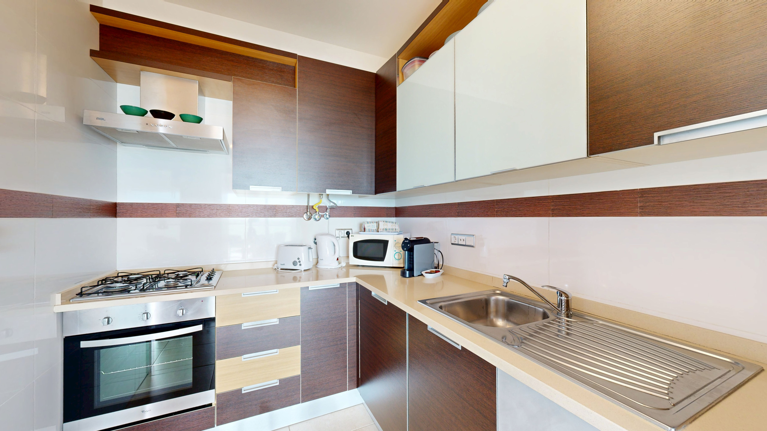 The kitchenette is very functional and equipped with the following appliances, electric cooker with 2 hobs, fridge, microwave, toaster and kettle, Dolce Gusto capsule coffee machine and washing machine.