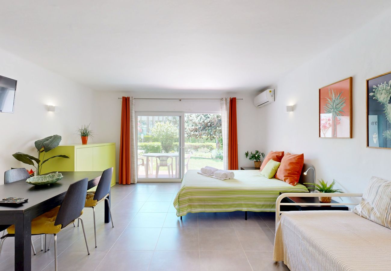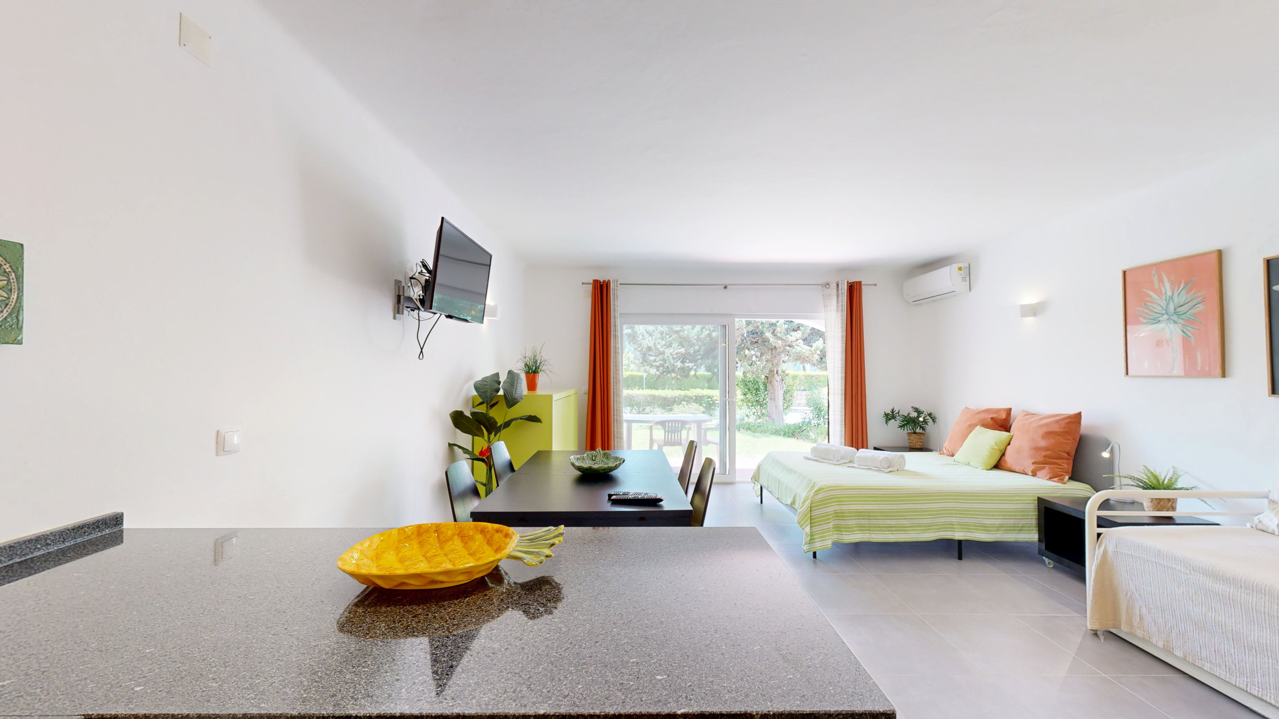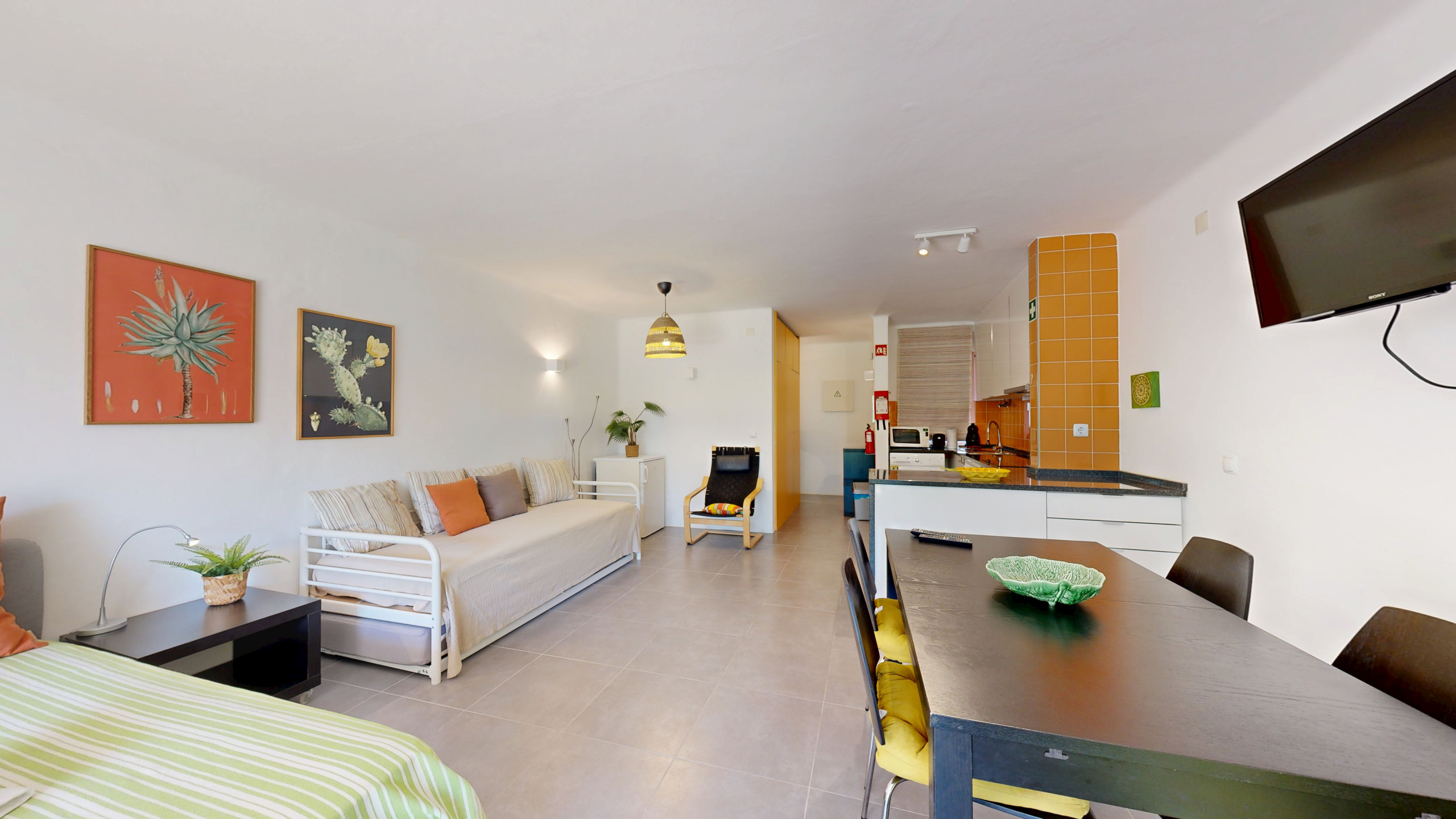 The living room has two distinct living and dining areas. The living area has a sofa that converts into two single beds, a sleeping area consisting of a double bed and is equipped with a TV and free Wi-Fi. The dining area is next to the kitchen and has a 4-seater dining table with 4 chairs.