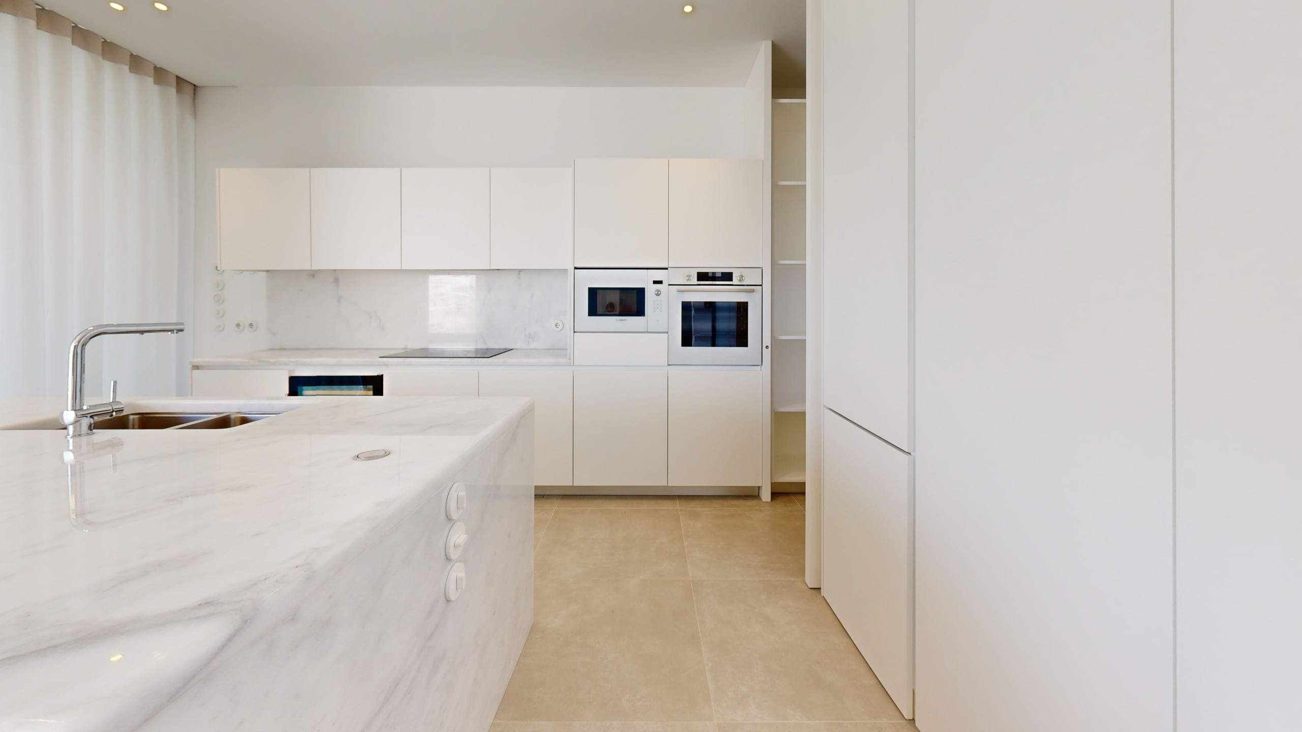 The kitchen is fully equipped with Bosch appliances, including a wine cellar, pantry, and laundry area.